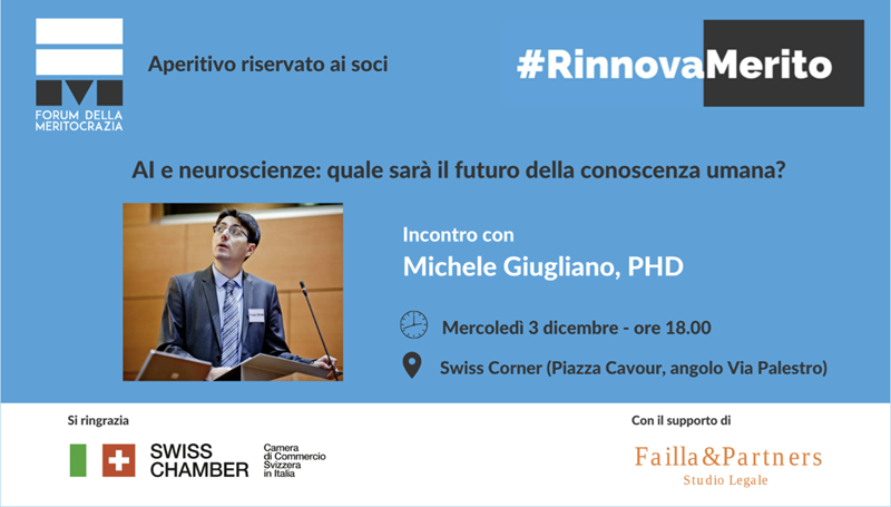 L’incontro dei soci del Forum della Meritocrazia con Michele Giuliano si terrà presso lo Swiss Corner, Piazza Cavour, angolo Via Palestro, dalle 18.00 alle 20.00, con accoglienza a partire dalle 17.30.